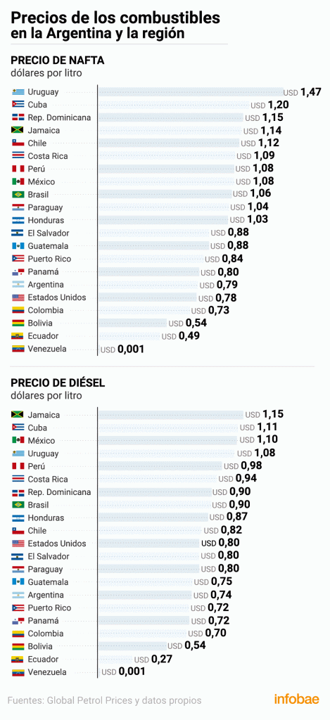 En el mercado local, desde el jueves pasado, el litro de nafta súper se comercializa en alrededor de $50 (unos USD 0,79 centavos) y el litro de diesel $47 (unos USD 0,74 centavos), tomando los precios de la ciudad de Buenos Aires. En la comparación con los países de América Latina y los Estados Unidos, esos precios están solo por encima de algunos países, como los Estados Unidos, Colombia, Bolivia, Ecuador y Venezuela, según un relevamiento de la plataforma Global Petrol Prices.